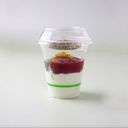 Zesty berry garnola yoghurt topped with fresh strawberries, raspberry coulis, orange peeled, blueberries, matcha chia seeds and granola.