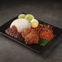 "All-time favourite aromatic coconut milk rice with a crispy chicken wing, sweet-savory sambal, peanuts,ikan bilis, and egg. Finished with our signature Hae Bee Hiam ( Udang Kering ) "