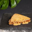A sweet, fluffy pancake filled with smooth red bean paste, often enjoyed as a snack.