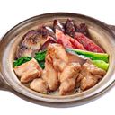 火锅汤,配料有蔬菜,鸡蛋,鸡肉肠,肉丸,蟹柳,炸豆皮,粉丝,和所选肉类