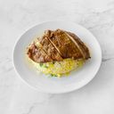 Tender slices of slow-cooked meat, bursting with savory flavors and served with steamed rice.