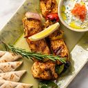 Two marinated Chicken skewers with bell pepper and onion served with Roma Tomato, Red Onion, Tzatziki dip and regular Greek Pita.