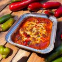 Beef sausages in our spicy marinara sauce, topped with parmesan and baked with mozzarella.