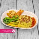 Savory rice served with seasoned vegetarian protein and fresh vegetables, garnished with herbs.