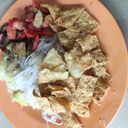 Thin flour skin wrapped around cooked vegetables, egg, lettuce and an assortment of garnishes and deep fried