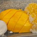 Sweet, ripe mango served over coconut-infused sticky rice, a tropical delight bursting with flavor.