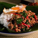 Wok-fried with hot basil, garlic and freshly chopped green and red chili. Served with steamed jasmine rice and sunny side fried egg