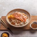 All-time favourite! Torched norwegian mentaiko salmon bowl with Japanese pearl rice, pickles and crispy tempura crumbs .