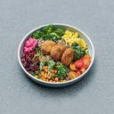 Falafel, Broccoli, Kale, Spiced Chickpeas, Quinoa, Dukkah, Dried Cranberries, Corn Kernels, Beets Miso Hummus, Cherry Tomatoes, Carrot Sesame Dressing