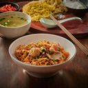 Comforting soup with pork balls and fishballs, topped with minced pork and beansprouts.