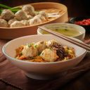 Noodles with homemade pork balls and fried pork balls, topped with minced pork and braised mushroom.