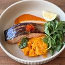 baked miso marinated salmon w homemade sweet potato mash, romesco, pesto sauce, tobiko & salad