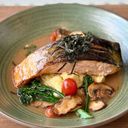 24 hours miso marinated salmon served on mash potatoes w miso broth, broccolini, cherry tomatoes, mushrooms & nori