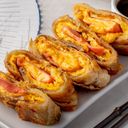 Thin, crispy egg crepe filled with savory ingredients like floss, cheese, and pickled vegetables.