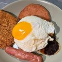 Nasi lemak with spicy chicken cutlet, sunny side up, Luncheon meat, hot dog, and Chili.