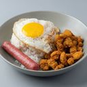 Nasi Lemak, with spicy chicken popcorn, hot dog and sunny side