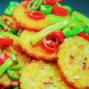 Crispy sliced potatoes stir-fried with fragrant spices and vegetables, creating a flavorful and satisfying dish.