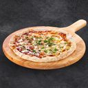 A classic Margherita pizza with fresh tomatoes, creamy mozzarella, fragrant basil, and a crispy crust.