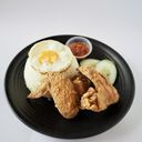 Traditional coconut rice with 2 fried chicken wings, egg, cucumber and sambal chilli.