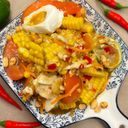 Spicy sweet corn salad with salty egg, tomatoes, peanuts & lime.