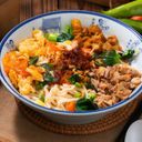 Savory rice noodles topped with minced meat, vegetables, and flavorful broth.