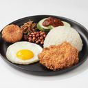 1.)Rice infused with fresh undiluted coconut milk 2.)Crunchy ground peanut and peeled anchovies 3.) Traditional sambal (cooked in slow heat for over 5 hours and included gula melaka, dried shrimps, belachan, etc) 5.) Freshly fried sunny side up eggs 6.) Chicken Katsudon Fillet 7.) Begedel in egg coating - Malay traditional fried mashed potatoes