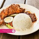 Fragrant rice cooked in coconut milk, served with spicy chicken, sambal, and crunchy accompaniments.