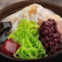 Refreshing coconut milk dessert with pandan jelly, red beans, and palm sugar syrup.