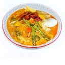 Traditional laksa served with thick rice noodles and beansprout, has a super strong coconout aroma and boiled fish. Shredded cucumber, boiled egg and big dollop of hot chili paste are added and served as garnish.