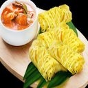A yellowish lacy pancake served with curry chicken and special homemade chilli as well as half hardboiled egg and fresh vegetables.
