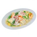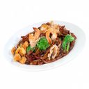 Stir-fried rice vermicelli with seafood, vegetables, and a savory white sauce.