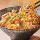 Marinated chicken karaage served over a bed of Japanese rice and topped with creamy scrambled egg, delivering a harmonious blend of textures and flavors in every satisfying bite