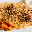 Fragrant rice dish with spices, herbs, and tender meat, often served with raita or salad.