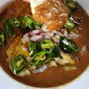 Savory foul medames blended with chefs special spices, topped with fresh chili, onions, a fried egg, and melted ghee. Served with soft, warm bread for the perfect pairing.