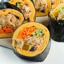 Sweet tofu skin(inari) with Tuna mayo, refreshing cucumber, crunchy carrot, Korean radish, burdock, and fluffy egg rolled up to perfection.