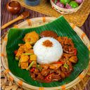 Braised in a creamy, aromatic green gulai curry, infused with coconut milk and traditional Padang herbs. Comes with fragrant rice, crispy tahu & tempeh, fresh veggies, and our signature sambal penyet.