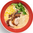 Rich, creamy broth with noodles, topped with savory ingredients and aromatic garnishes.