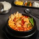 Prawns, mussels, minced pork and clams stewed in a rich spicy broth, topped with delicate sundubu, smoked tomatoes, and egg. Served with rice and side dishes.