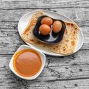 Crispy and flaky flatbread filled with eggs and gooey cheese, served with a side of curry