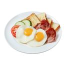Sunny-side eggs with crispy bacon, served with butter toasts, cucumber and tomato slice.