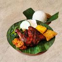 Comes in Thigh part only. Flame-Grilled Duck with Sambal Belacan Set with Rice . Marinated in our Special Kecap Manis Mix, flamed-grilled to juicy perfection and topped with Lemongrass-infused Chilli mix that brings you an Original and Juicy Taste of Bali. Served with Tofu, Tempeh and Side Vegetables.