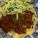 Noodles topped with savory minced meat sauce, often accompanied by fresh vegetables and herbs.