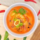Traditional spicy and sour Thai tom yum koong served with fresh seafood, vegetables and herbs