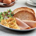 Scrambled Eggs, Turkey Ham and Chicken Sausage served with Toasted Bread of the Day and Seasonal Side Salad