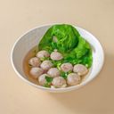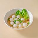 A savory broth filled with tender fishballs, vegetables, and aromatic herbs.