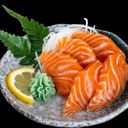 Fresh, raw slices of salmon, served as a delicacy in Japanese cuisine.