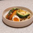Quinoa, miso salmon, sauteed baby corn, avocado, hanjuku egg, spring onion, furikake & roasted sesame dressing