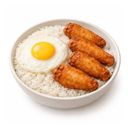 Savory luncheon meat paired with fluffy rice and a fried egg, offering a simple yet comforting rice meal.