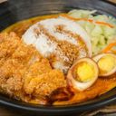 A well-flavoured midly-spiced curry laddled over a plate of fragrant steamed rice, topped with deep fried chicken cutlet.