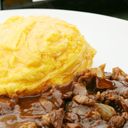 Garlic butter rice wrapped in omelette with beef cubes, mushroom in brown sauce
